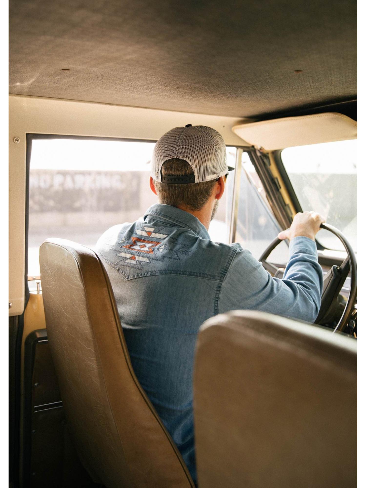 Tonopah men's shirt in durable washed fabric with snap buttons, embroidered western yoke and vintage finish, signed Daytona 73.