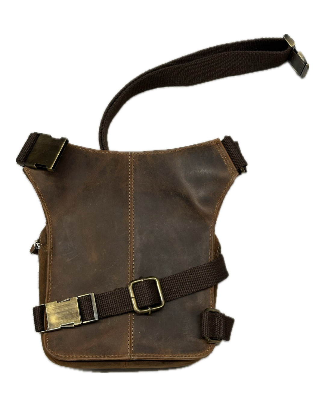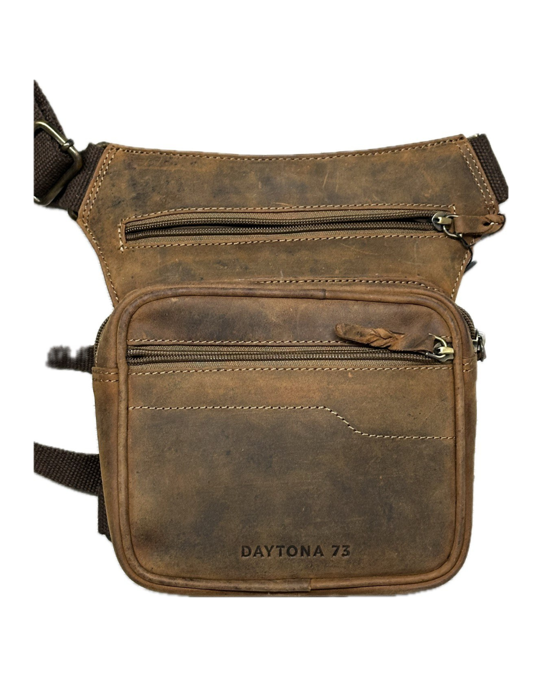 The Daytona 73 unisex leg pouch is the ideal accessory for motorcyclists and lovers of vintage style, crafted from high-quality natural leather with a distressed finish for durability and a unique, worn-in look. It features an adjustable leg and waist strap with antiqued metal buckles, a sturdy zippered main pocket with plenty of space for a smartphone, wallet, and accessories, and front zippered pockets for easy organization and quick access. The Daytona 73 logo embossed on the leather evokes the authentic biker spirit and enhances the design. Perfect for those seeking a comfortable, secure, and distinctive motorcycle pouch, this model is a distinctive and versatile accessory, ideal for both motorcycle touring and everyday use.