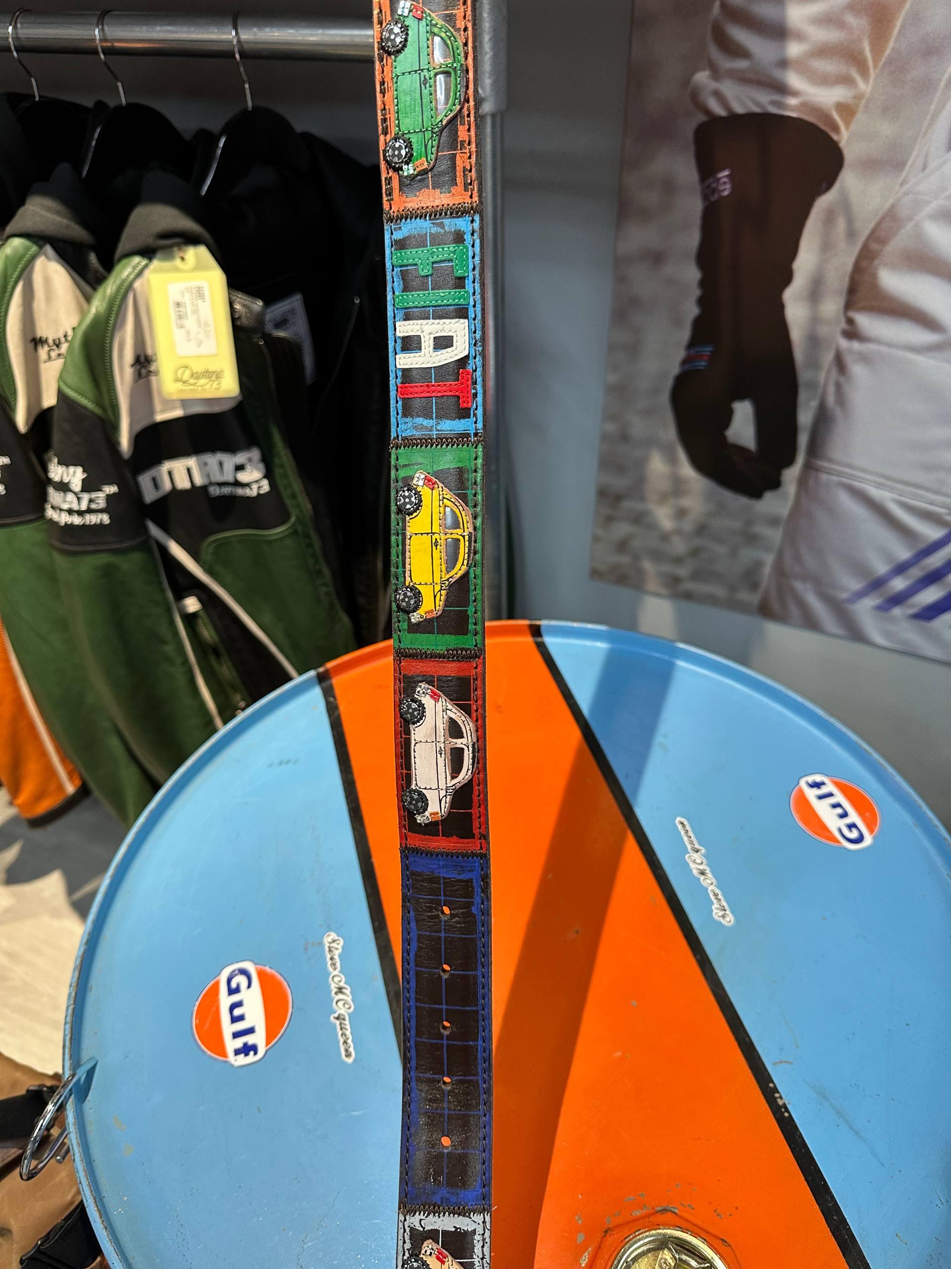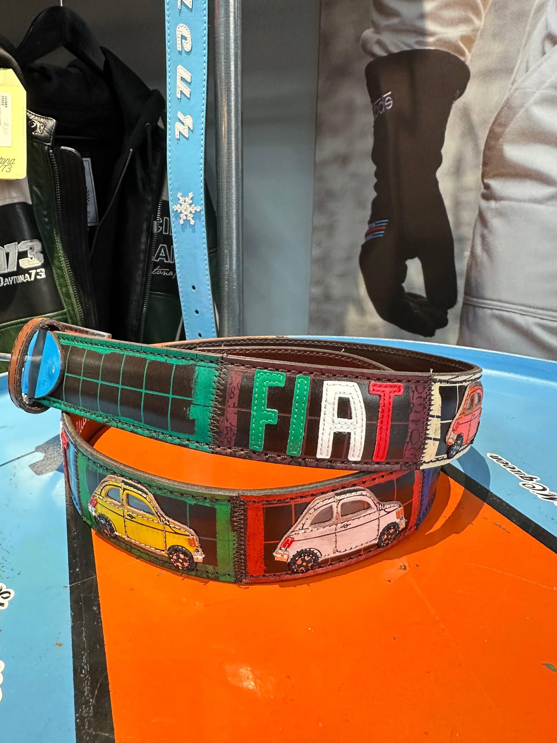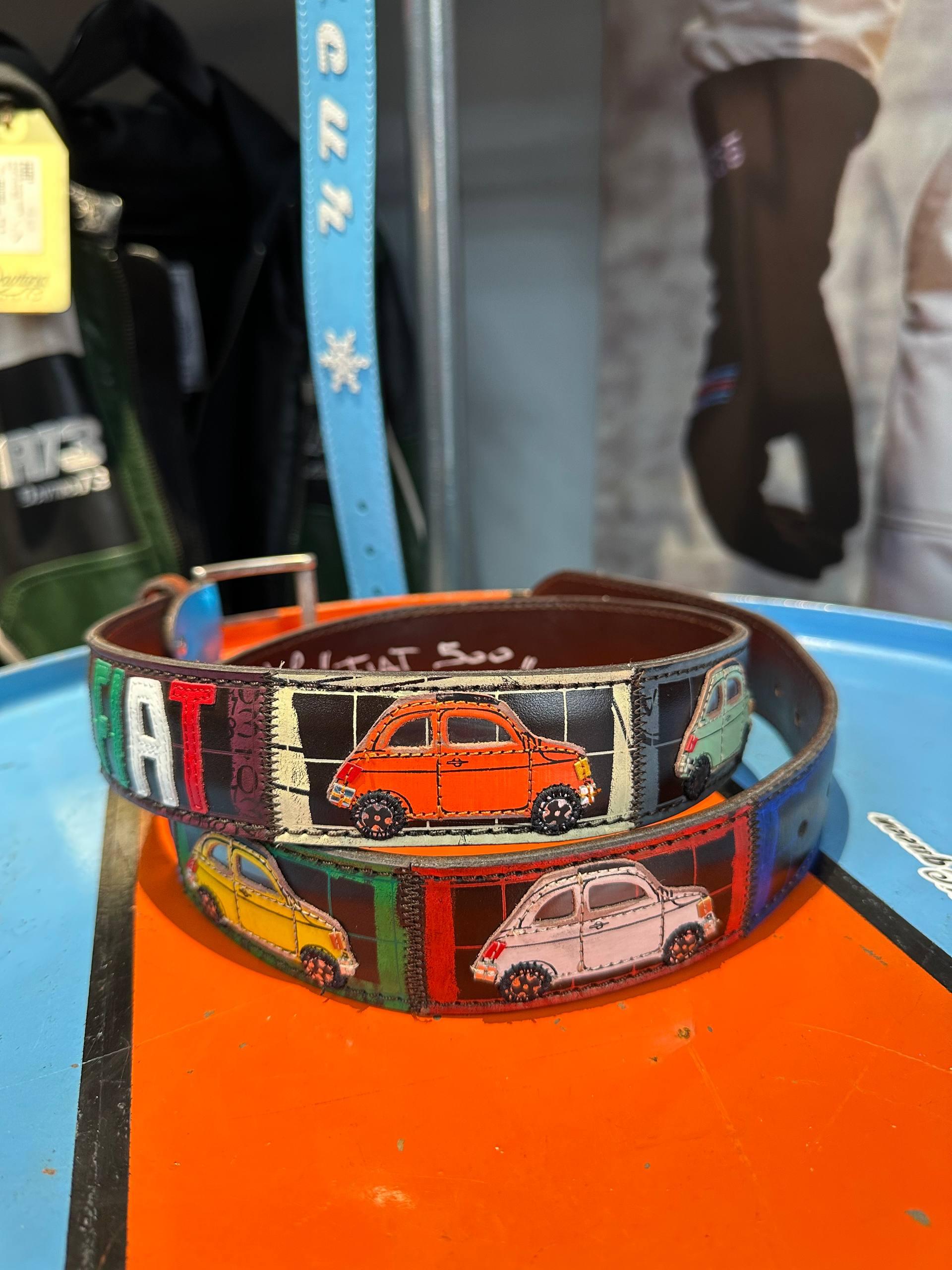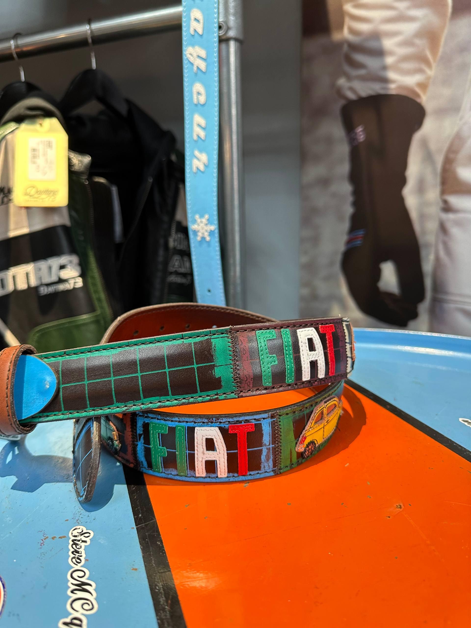 Handcrafted genuine leather belt with patches inspired by motorsport and motorcycle icons. Handmade in Italy, it combines quality, comfort, and vintage design. Fiat 500 version.